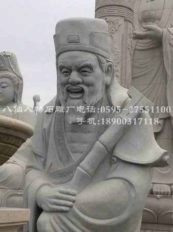 呂洞賓:頭戴瓦棱帽,攀身披道袍,腰系絲帶。身背青鋒劍,手執拂塵,腳穿云頭靴,面目方正,留三綹長須,于道貌岸然中略帶幾分風流相。