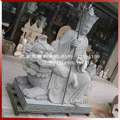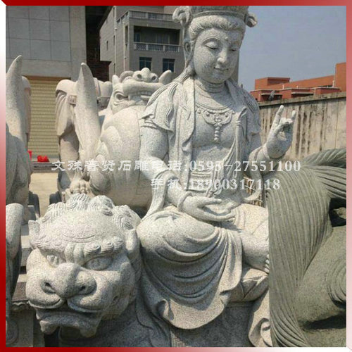 文殊菩薩:大智文殊菩薩右手高舉慧劍,寓意斬斷煩惱。左手持蓮,且蓮上通常還有經卷