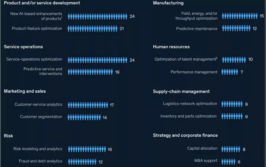 從公司內(nèi)部業(yè)務(wù)線看,下圖顯示了各部門的AI使用率(單位:%):
