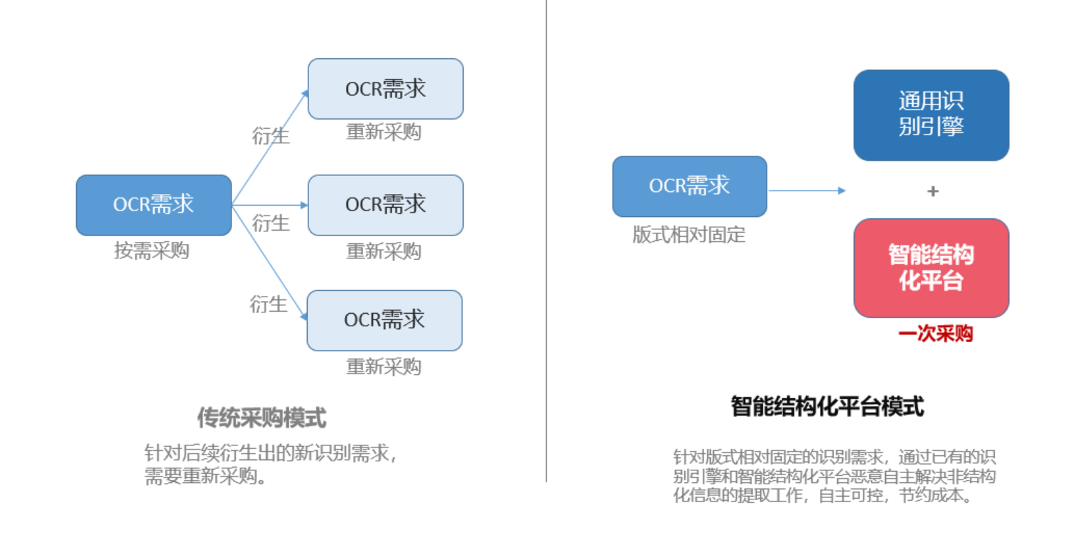 智能結(jié)構(gòu)化平臺(tái)使得行方后續(xù)針對(duì)板式相對(duì)固定的待識(shí)別憑證,可以通過已有的通用識(shí)別引擎和智能結(jié)構(gòu)化平臺(tái)可以自主解決非結(jié)構(gòu)化信息的提取工作,達(dá)到自主可控和節(jié)省成本的目的,解決行方新板式OCR識(shí)別需要從新采購及定制開發(fā)的工作。