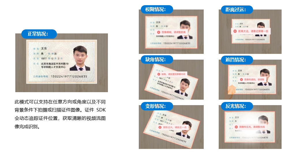“證件質(zhì)檢,顧名思義就是證件的質(zhì)量檢測。在證件識別的拍攝過程中,由于環(huán)境和拍攝的影響,難免會(huì)出現(xiàn)反光、證件被遮擋、圖像模糊等異常情況。而證件質(zhì)檢就是檢測這些異常情況并瞬間反饋提示的功能。”
