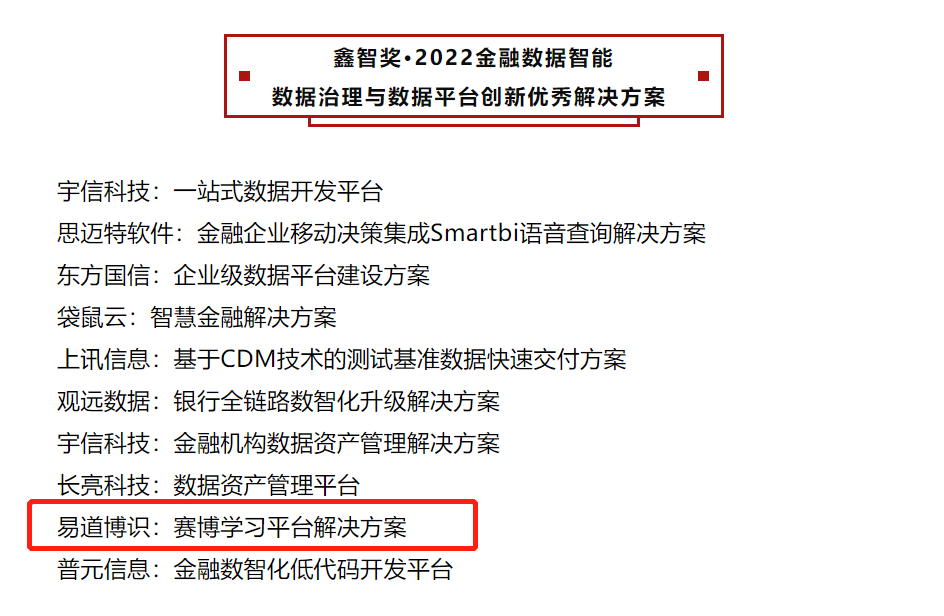 鑫,多金,數(shù)據(jù)即未來的財富;智,代表智能。由金科創(chuàng)新社主辦、全球金融專業(yè)人士協(xié)會支持的“鑫智獎·第四屆金融數(shù)據(jù)智能優(yōu)秀解決方案評選”圓滿結(jié)束,易道博識的賽博學(xué)習(xí)平臺解決方案入選“數(shù)據(jù)治理與數(shù)據(jù)平臺創(chuàng)新優(yōu)秀解決方案”。