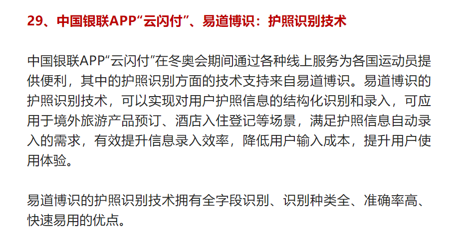 冬奧會上匯集了各個(gè)領(lǐng)域最頂尖的科技,各個(gè)企業(yè)八仙過海各顯神通,都拿出自己引以為傲的金牌產(chǎn)品。中國銀聯(lián)的APP“云閃付”,就通過各種線上服務(wù)為各國運(yùn)動(dòng)員提供便利,而其中的護(hù)照識別方面的技術(shù)支持,來自易道博識。