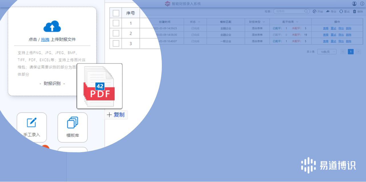 可批量拖拽上傳財(cái)報(bào)文檔,支持PNG、JPG、JPEG、BMP、TIFF、PDF、EXCEL等多種格式文件,支持上傳壓縮包,支持圖片自動(dòng)去重,支持分頁(yè)報(bào)表自動(dòng)合并。