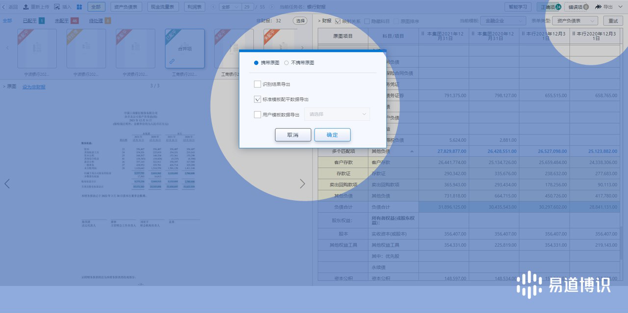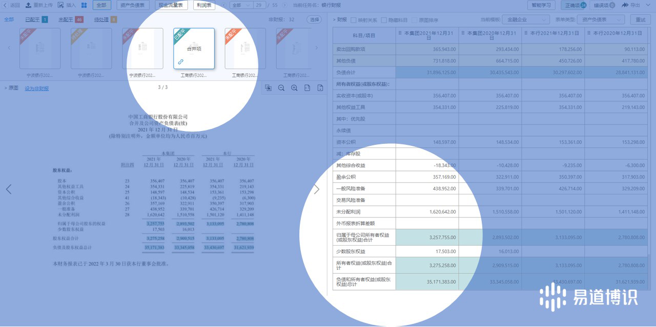 文檔上傳完成后,系統(tǒng)自動(dòng)對(duì)文件完成識(shí)別與解析操作,自動(dòng)對(duì)數(shù)據(jù)進(jìn)行配平校驗(yàn),未匹配項(xiàng)、匹配錯(cuò)誤項(xiàng)通過(guò)不同顏色高亮顯示。用戶選擇模板編輯區(qū)內(nèi)數(shù)據(jù)時(shí),系統(tǒng)會(huì)自動(dòng)匹配左側(cè)原圖對(duì)應(yīng)內(nèi)容,并做突出顯示,方便用戶對(duì)照數(shù)據(jù)。