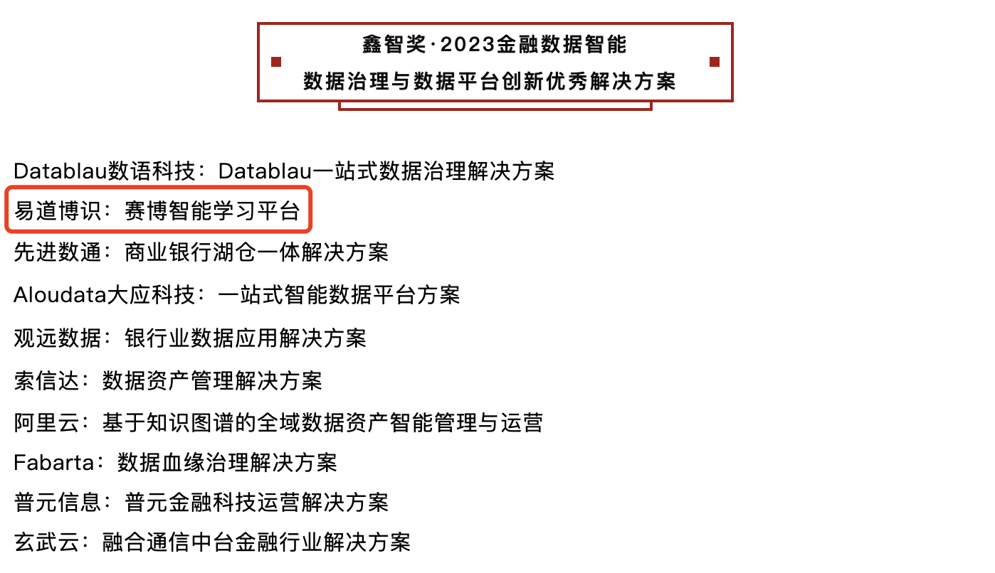 為展示金融企業(yè)數(shù)據(jù)管理和數(shù)據(jù)平臺(tái)智能化轉(zhuǎn)型成果,分享大數(shù)據(jù)和人工智能在風(fēng)控、營(yíng)銷、產(chǎn)品、運(yùn)營(yíng)等場(chǎng)景的落地實(shí)踐,探討“金融科技+數(shù)據(jù)智能”的創(chuàng)新應(yīng)用和未來發(fā)展,在全球金融專業(yè)人士協(xié)會(huì)的支持下,金科創(chuàng)新社主辦了“2023鑫智獎(jiǎng)·第五屆金融數(shù)據(jù)智能優(yōu)秀解決方案評(píng)選”活動(dòng)。易道博識(shí)賽博智能學(xué)習(xí)平臺(tái)解決方案成功入選,并榮獲“數(shù)據(jù)治理與數(shù)據(jù)平臺(tái)創(chuàng)新優(yōu)秀解決方案”。