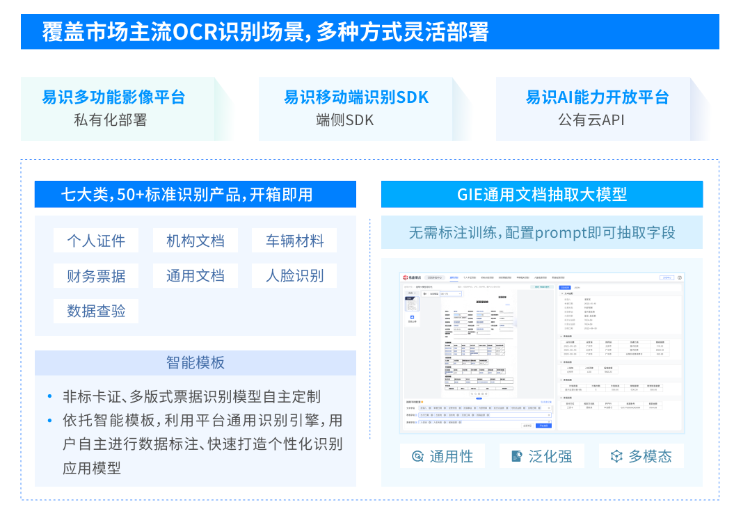 針對(duì)不同規(guī)模和需求的醫(yī)療機(jī)構(gòu),易道博識(shí)的“易識(shí)”產(chǎn)品線提供了定制化的解決方案,滿足了從大型醫(yī)院到中小型診所的多種需求。以“易識(shí)AI能力開放平臺(tái)”為例,該平臺(tái)支持多種票據(jù)和證件識(shí)別功能,并通過API接口使用戶能夠快速調(diào)用、輕松集成。這種云端支持方式對(duì)初期預(yù)算有限的機(jī)構(gòu)尤為適用,不僅降低了部署門檻,還為后續(xù)的擴(kuò)展提供了可能。而對(duì)于那些需要在移動(dòng)端實(shí)現(xiàn)票據(jù)識(shí)別的場(chǎng)景,“易識(shí)移動(dòng)端識(shí)別SDK”在提供高性能識(shí)別能力的同時(shí),也保持了設(shè)備的輕量級(jí)運(yùn)作,確保在移動(dòng)環(huán)境下同樣能夠獲得高效、精準(zhǔn)的識(shí)別效果。