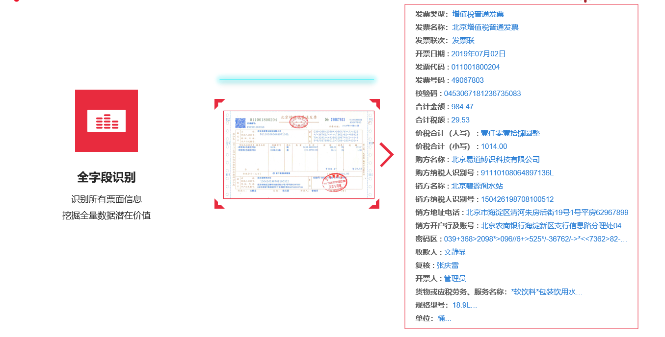 易道博識發(fā)票識別準(zhǔn)確率可以達(dá)到99。5%以上。,并實現(xiàn)毫秒級識別(300毫秒),對于復(fù)雜發(fā)票,可以使用GIE大模型(OCR大模型)直接識別,準(zhǔn)確提取任意復(fù)雜版式票據(jù)。