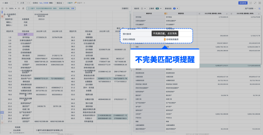 ●當(dāng)發(fā)現(xiàn)潛在的不一致或錯(cuò)誤數(shù)據(jù)時(shí),系統(tǒng)會(huì)高亮顯示相關(guān)數(shù)據(jù),并且科目數(shù)值之間可以相互定位和對(duì)照顯示,極大地便利了財(cái)務(wù)人員進(jìn)行手動(dòng)復(fù)核與修正,實(shí)現(xiàn)了人機(jī)協(xié)同,從根本上提升了財(cái)務(wù)數(shù)據(jù)的準(zhǔn)確性和可靠性,顯著提高了整體工作效率。