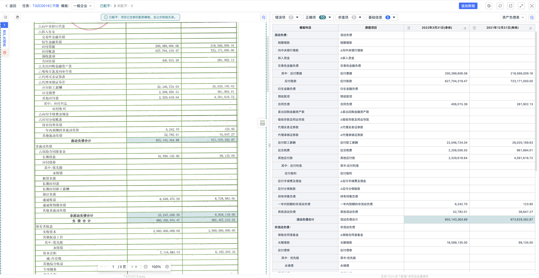 系統(tǒng)內(nèi)置基于財報勾稽關(guān)系的智能校驗引擎,能夠自動完成試算平衡和邏輯校驗,一次配平率超過95%,。若在校驗過程中發(fā)現(xiàn)不平衡或潛在錯誤,系統(tǒng)會高亮提示問題項,并通過“錯誤項面板”、“模板窗格”和“原圖窗格”的數(shù)據(jù)聯(lián)動,快速引導(dǎo)用戶定位差異源頭。