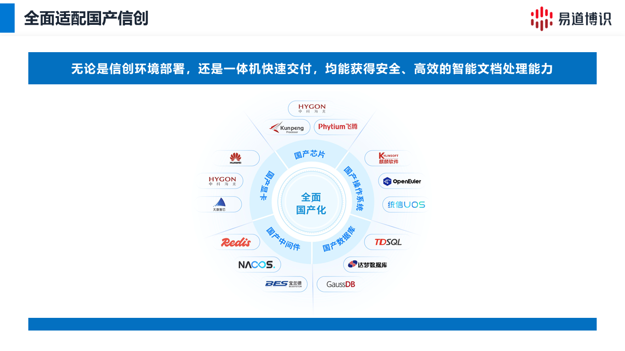 更關(guān)鍵的是,易道博識的整套方案已全面適配國產(chǎn)信創(chuàng)體系,能與主流國產(chǎn)芯片、服務(wù)器、操作系統(tǒng)無縫融合,確保了金融數(shù)據(jù)處理方案的高安全性和高可靠性。