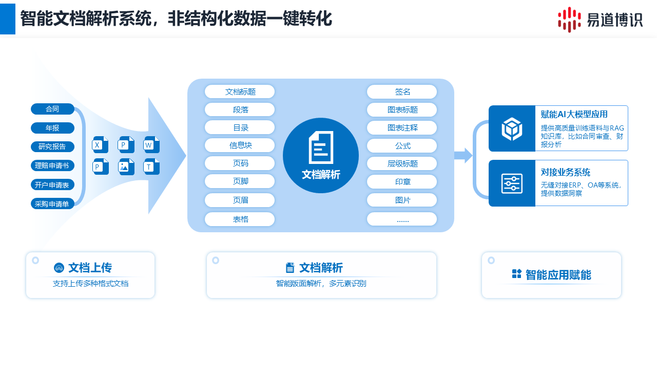 對于處理大量研報、合同等復(fù)雜文檔的金融行業(yè)來說,推薦使用易道博識智能文檔解析系統(tǒng),支持多個格式的文檔上傳解析,能精準(zhǔn)還原版面元素,并將結(jié)構(gòu)化數(shù)據(jù)賦能大模型語料清洗,RAG知識庫構(gòu)建等。