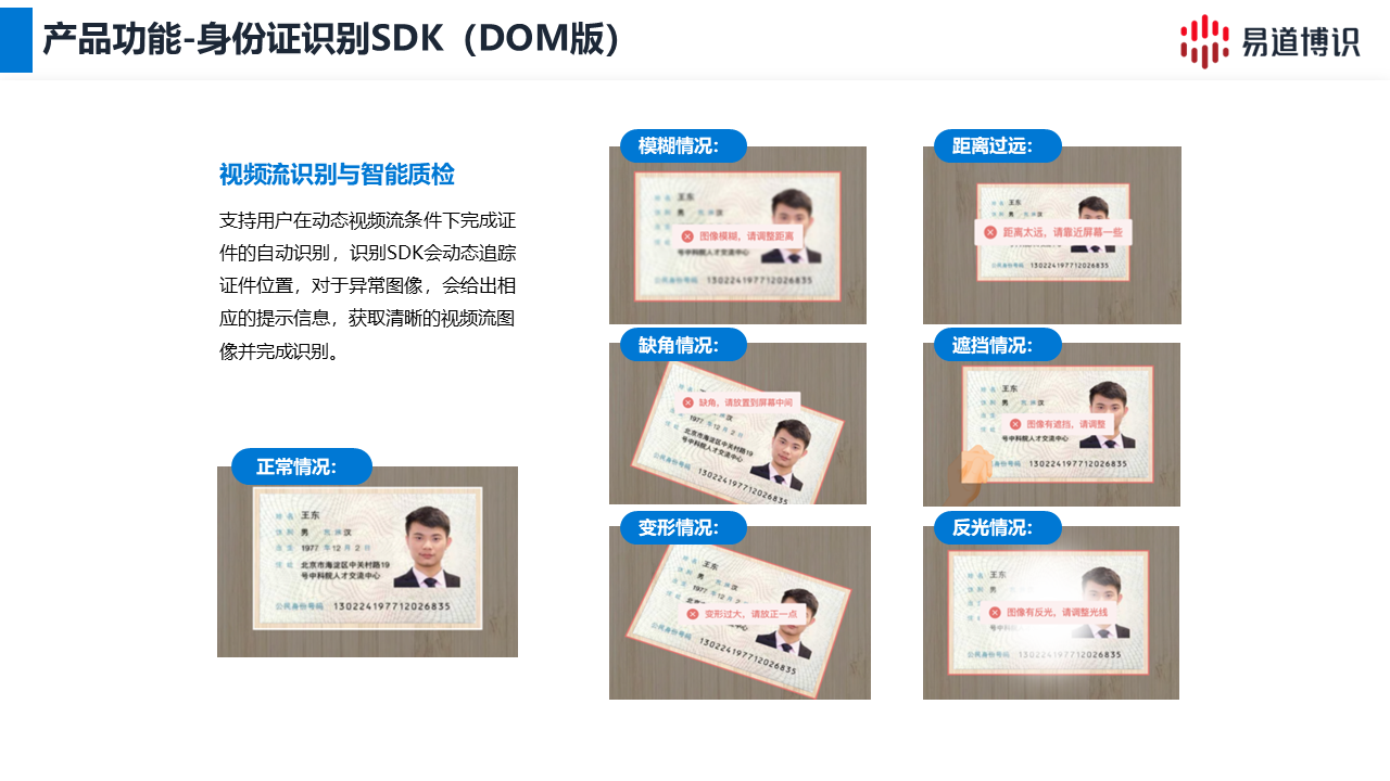 答:支持。行業(yè)領(lǐng)先的解決方案(如易道博識(shí))均提供視頻流動(dòng)態(tài)檢測功能。這能實(shí)時(shí)追蹤證件在屏幕中的位置,并即時(shí)反饋圖像異常(如反光、模糊),在用戶按下快門前就引導(dǎo)其拍出合規(guī)照片。