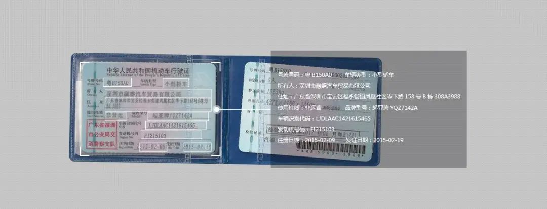 易道博識行駛證識別產品支持對機動車行駛證的關鍵字段識別,包括號牌號碼、車輛類型、所有人、住址、使用性質、品牌型號、車輛識別代號、發(fā)動機號碼、注冊日期、發(fā)證日期,速度快,精準度高。