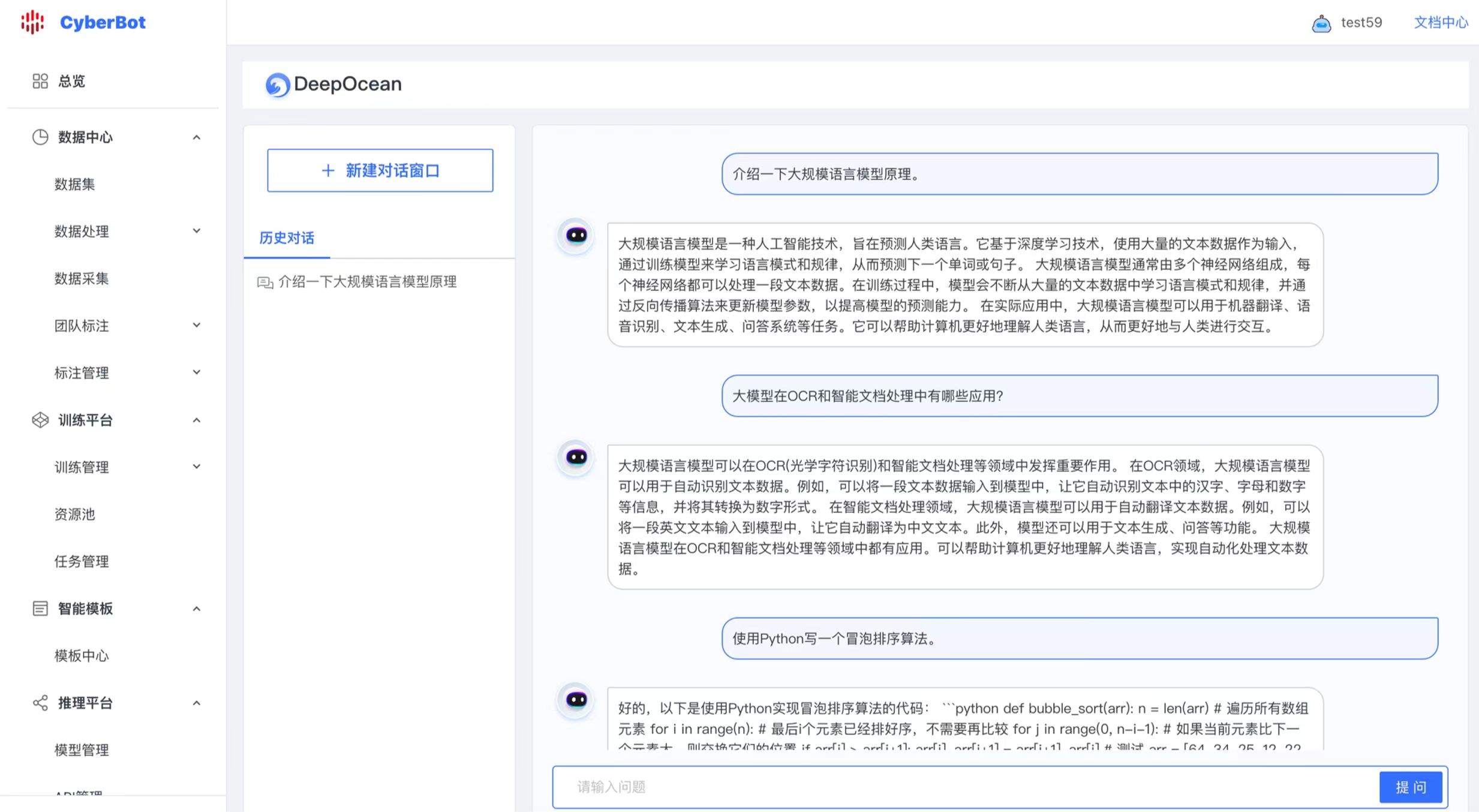 最后,通過賽博智能學習平臺,滄海大語言模型能夠滿足基于DCU服務器的訓練與推理。利用DCU本身對于生成式大語言模型在訓練和推理方面的性能加速優(yōu)勢,結合賽博平臺本身友好的可視化操作界面,能夠很好地滿足用戶快速模型訓練和場景數(shù)據(jù)調(diào)優(yōu)的需求;進一步通過模型一鍵部署功能,實現(xiàn)快速場景應用。