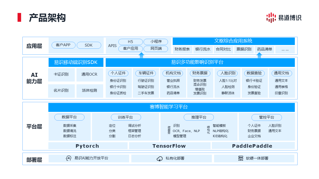 易道博識自成立以來一直致力于人工智能領(lǐng)域的技術(shù)研究與應(yīng)用開發(fā),為適應(yīng)國產(chǎn)化浪潮,易道博識自主研發(fā)全面適配信創(chuàng)產(chǎn)業(yè)智能文檔識別方案,依托賽博、易識、文樞及主流軟硬件產(chǎn)品基礎(chǔ)設(shè)施,為客戶提供基于信創(chuàng)環(huán)境的底層支撐能力,確保客戶在安全的環(huán)境下,實現(xiàn)對各類文檔的智能識別和處理,如財務(wù)報表、銀行流水、證件、票據(jù)等,提高金融機(jī)構(gòu)的工作效率,降低人工成本和安全風(fēng)險。