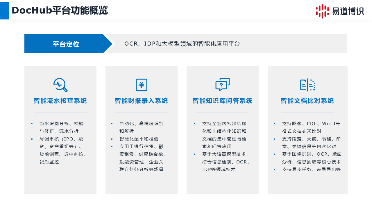 核心產(chǎn)品之一“文樞(DocHub)”,在OCR、IDP和大模型領域表現(xiàn)突出,不僅具備高度智能化的文檔信息處理能力,還擁有友好的系統(tǒng)界面,操作簡便,用戶可輕松上手。文樞平臺的應用范圍廣泛,適用于財務、審計、合同管理等多個部門,同時面向細分市場持續(xù)深化應用場景,支持賽博學習平臺和推理能力接入。