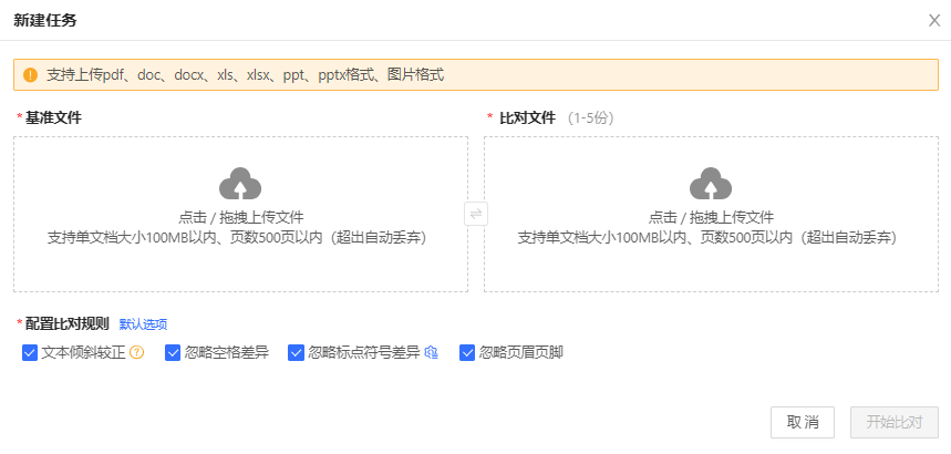 支持多種格式的文檔上傳和處理:包括pdf、doc、xls、pptx、圖片等,最多可比對500頁的超大文件,系統(tǒng)能夠同時處理多個文檔的比對任務(wù),實(shí)現(xiàn)一對多的比對需求。支持用戶自定義比對規(guī)則:如文本傾斜矯正、忽略空格差異和標(biāo)點(diǎn)符號差異等,滿足不同業(yè)務(wù)場景的需求。