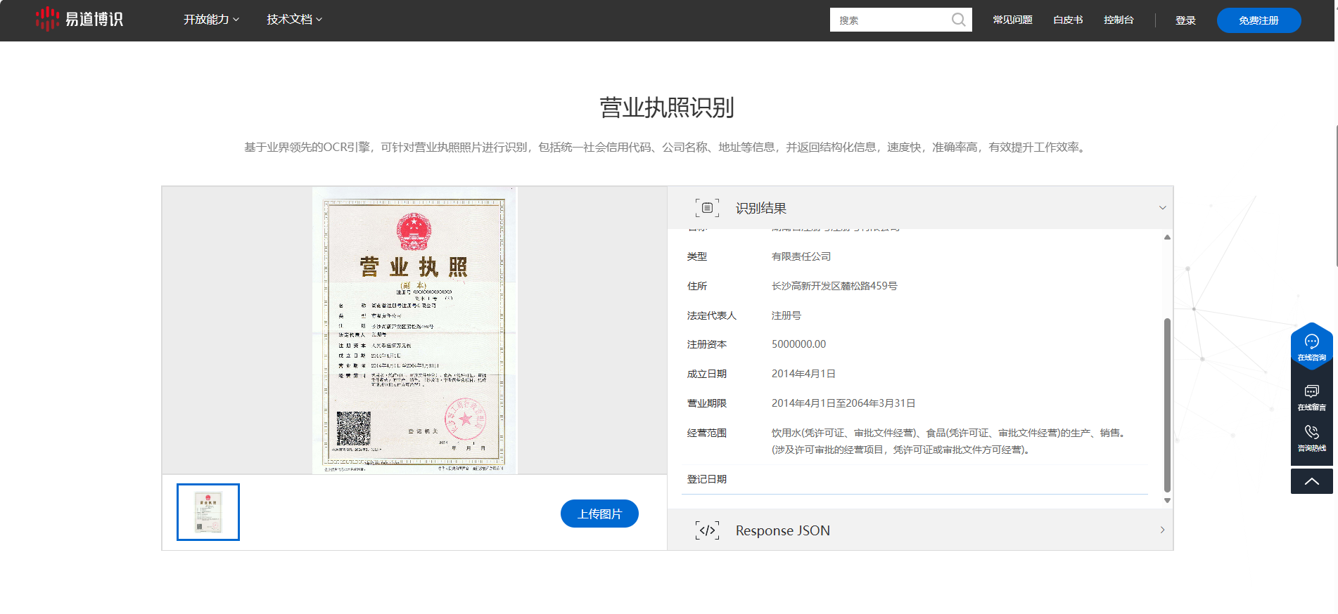 營業(yè)執(zhí)照OCR識別技術(shù)的出現(xiàn),標(biāo)志著機(jī)構(gòu)開戶流程進(jìn)入了一個全新的高效時代。易道博識的“易識”產(chǎn)品線基于深度學(xué)習(xí)技術(shù),提供了強(qiáng)大的OCR識別功能,涵蓋了營業(yè)執(zhí)照、身份證等多種證件識別,包含7大類、50+標(biāo)準(zhǔn)卡證識別,滿足市場主流OCR識別需求,極大地提升了識別效率和準(zhǔn)確性。特別是“易識AI能力開放平臺”支持多種卡證識別功能,用戶可以通過調(diào)用API接口,輕松實(shí)現(xiàn)證件信息的提取與處理。同時,“易識移動端識別SDK”在移動端也能提供與服務(wù)器端相當(dāng)?shù)淖R別性能,特別適合遠(yuǎn)程開戶和移動支付等場景。