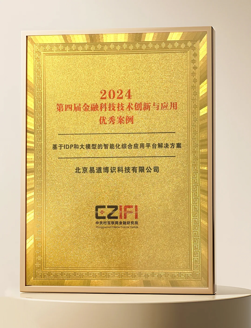大會(huì)匯集了來(lái)自政府監(jiān)管機(jī)構(gòu)、行業(yè)專家、金融機(jī)構(gòu)高層及金融科技企業(yè)的眾多嘉賓,以“人工智能、量子科技與未來(lái)科技發(fā)展:服務(wù)五篇大文章”為核心議題,共同探討科技最新趨勢(shì)與發(fā)展。作為本次盛會(huì)的重要環(huán)節(jié)之一,第四屆金融科技技術(shù)創(chuàng)新與應(yīng)用案例(2024)優(yōu)秀案例評(píng)選結(jié)果正式發(fā)布。易道博識(shí)憑借《基于IDP和大模型的智能化綜合應(yīng)用平臺(tái)解決方案》,從眾多參選項(xiàng)目中脫穎而出。