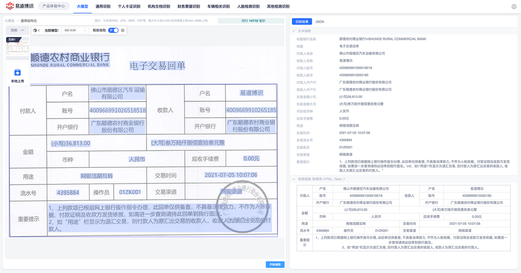 泛化能力強(qiáng):大模型在新場(chǎng)景下的適應(yīng)能力非常強(qiáng)。比如銀行交易回單,每家銀行的格式都不一樣,過去可能需要對(duì)每一種格式都做針對(duì)性的模型訓(xùn)練,現(xiàn)在用大模型,不需要專門訓(xùn)練,就能達(dá)到較為理想的識(shí)別效果。