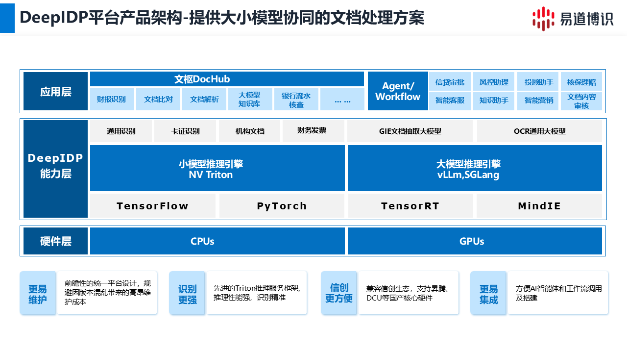 易道博識(shí)DeepIDP平臺(tái),采用大小模型協(xié)同架構(gòu),為企業(yè)提供兼具成本效益與高精度的解決方案。