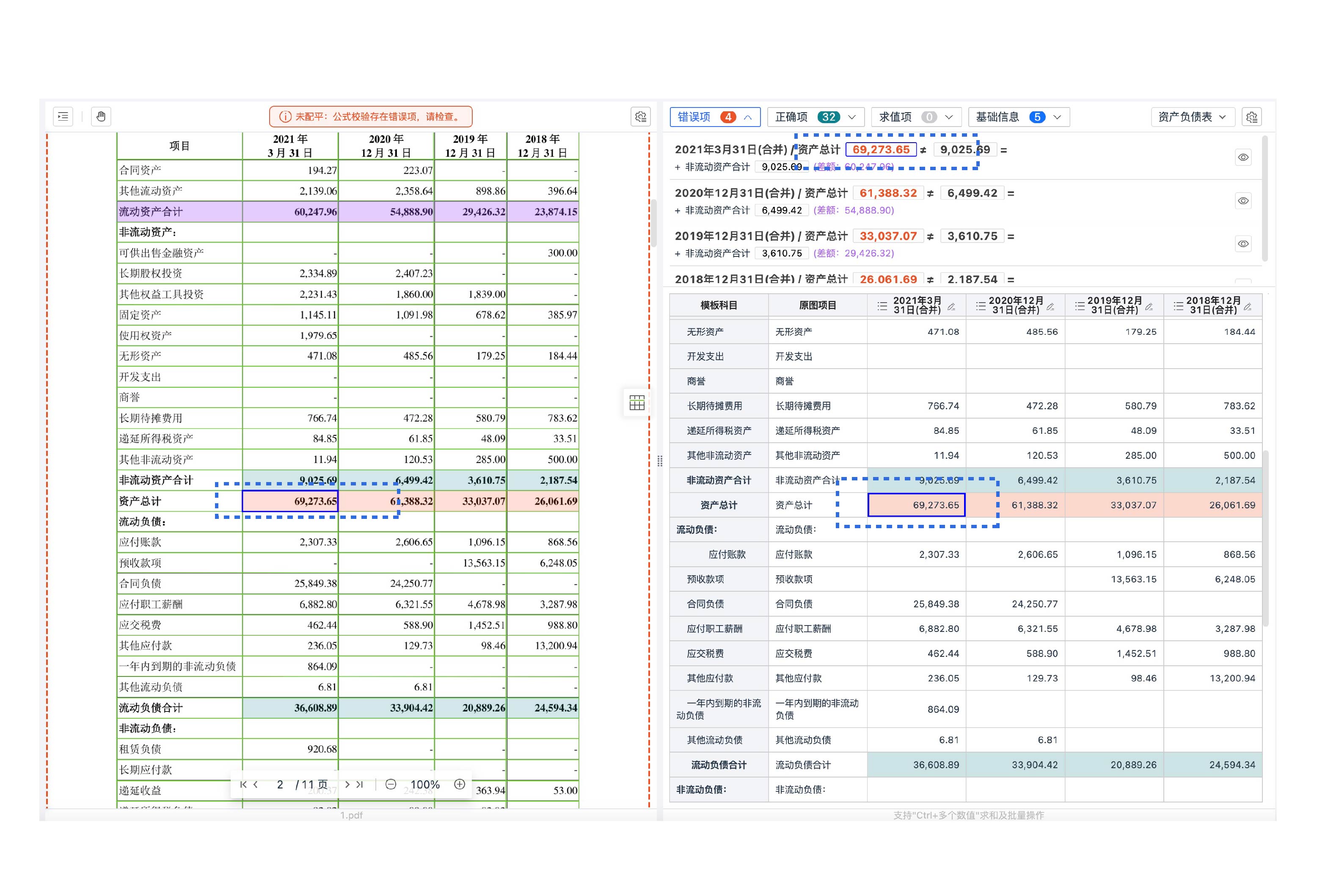 基于勾稽關(guān)系自動(dòng)配平校驗(yàn),對(duì)錯(cuò)誤項(xiàng)高亮提示。