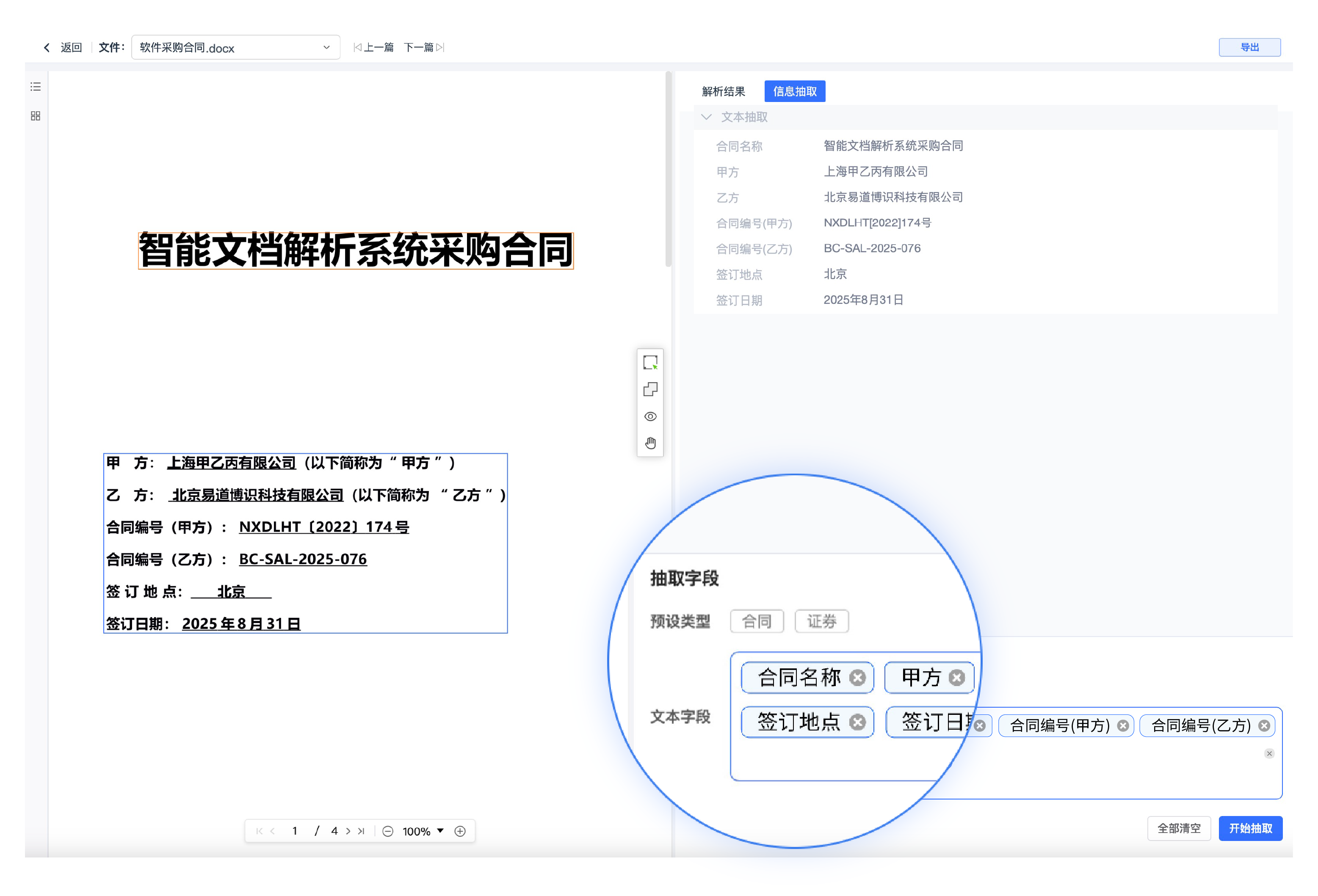 支持批量解析 PDF、JPG、PNG、Word等格式文檔。