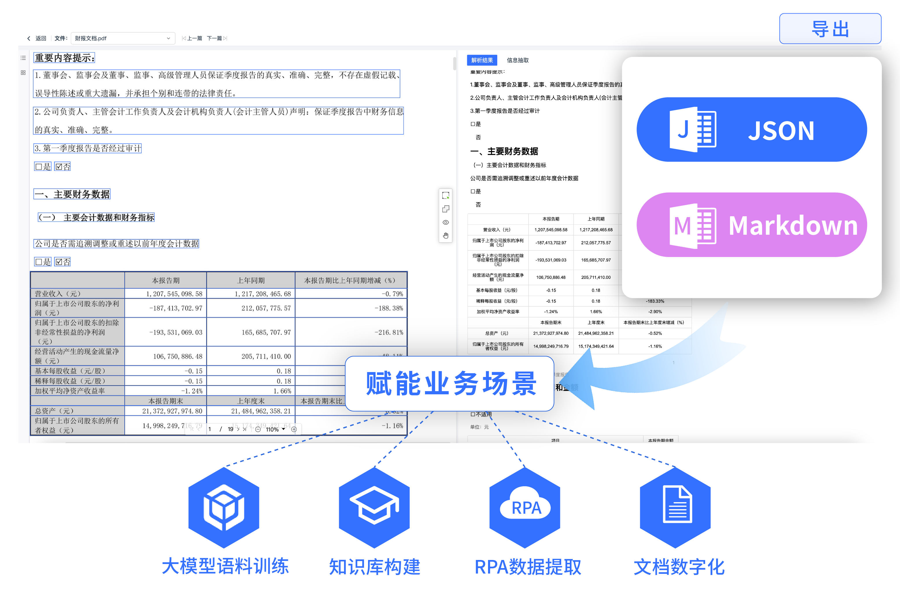 支持大模型語料訓(xùn)練、知識庫構(gòu)建、RPA數(shù)據(jù)提取、文檔數(shù)字化等業(yè)務(wù)場景。