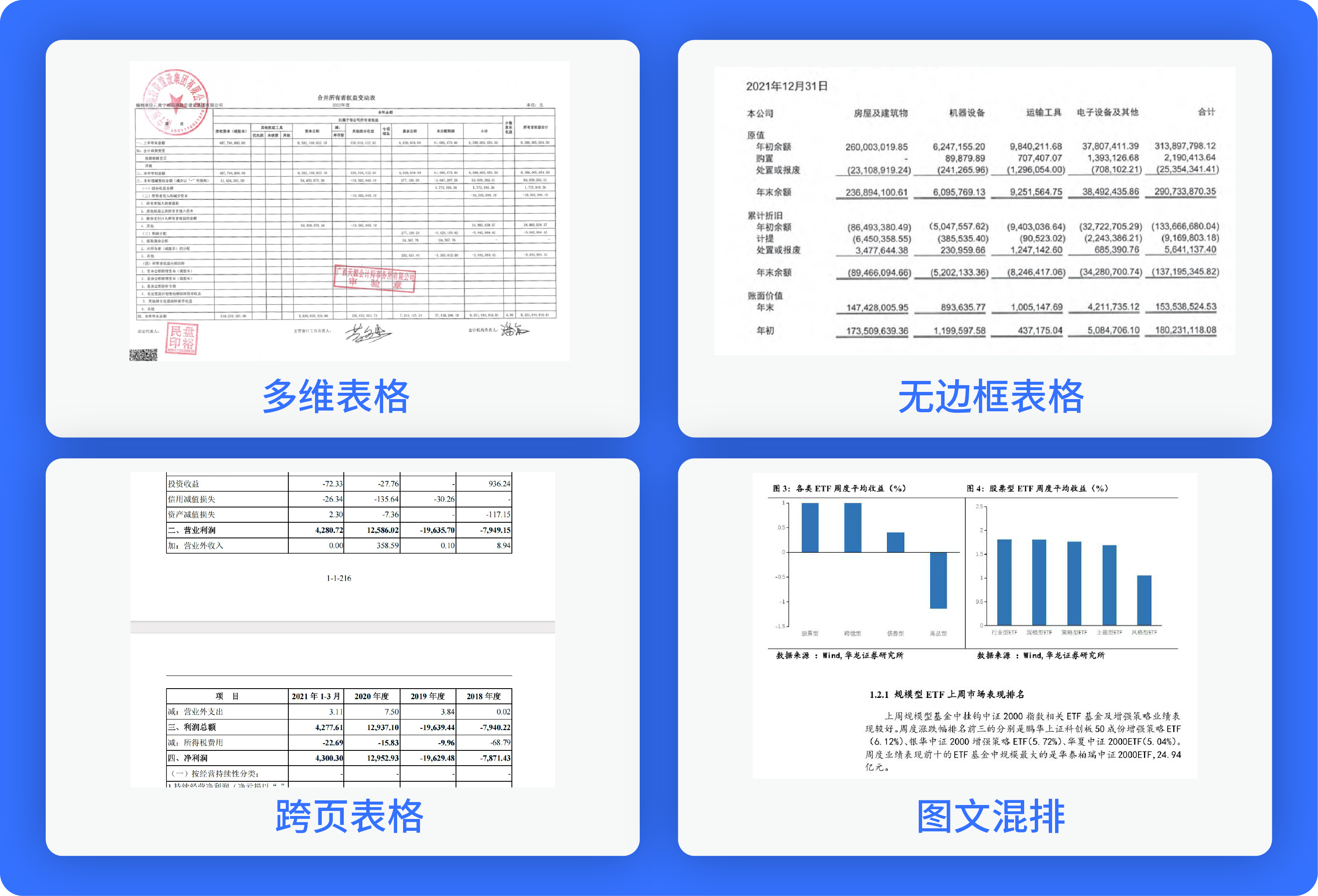 精準(zhǔn)解析多格式、多類型文檔,尤其擅長處理金融領(lǐng)域常見的異形表格與復(fù)雜排版。