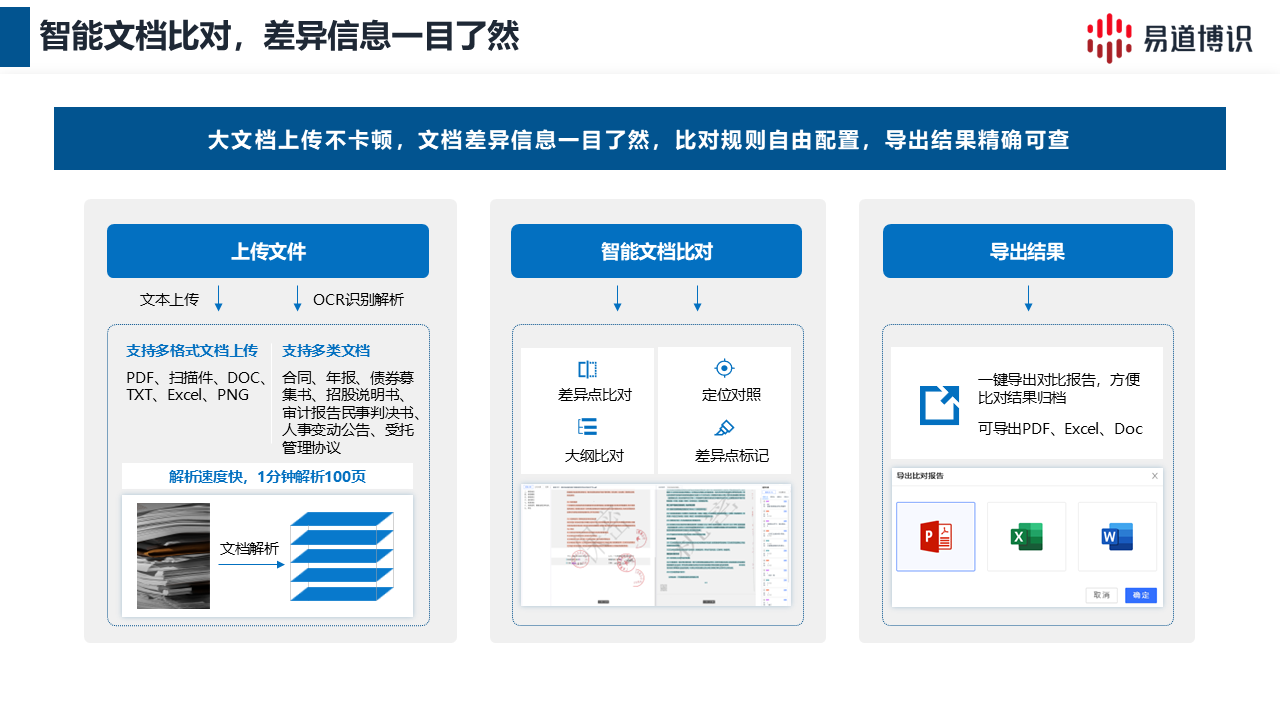 A:不會(huì)。易道博識(shí)智能文檔比對(duì)系統(tǒng)支持跨格式比對(duì),例如一份PDF與一份Word之間的比對(duì)。系統(tǒng)先將兩份文檔統(tǒng)一解析為結(jié)構(gòu)化數(shù)據(jù),再進(jìn)行內(nèi)容層面的差異識(shí)別。