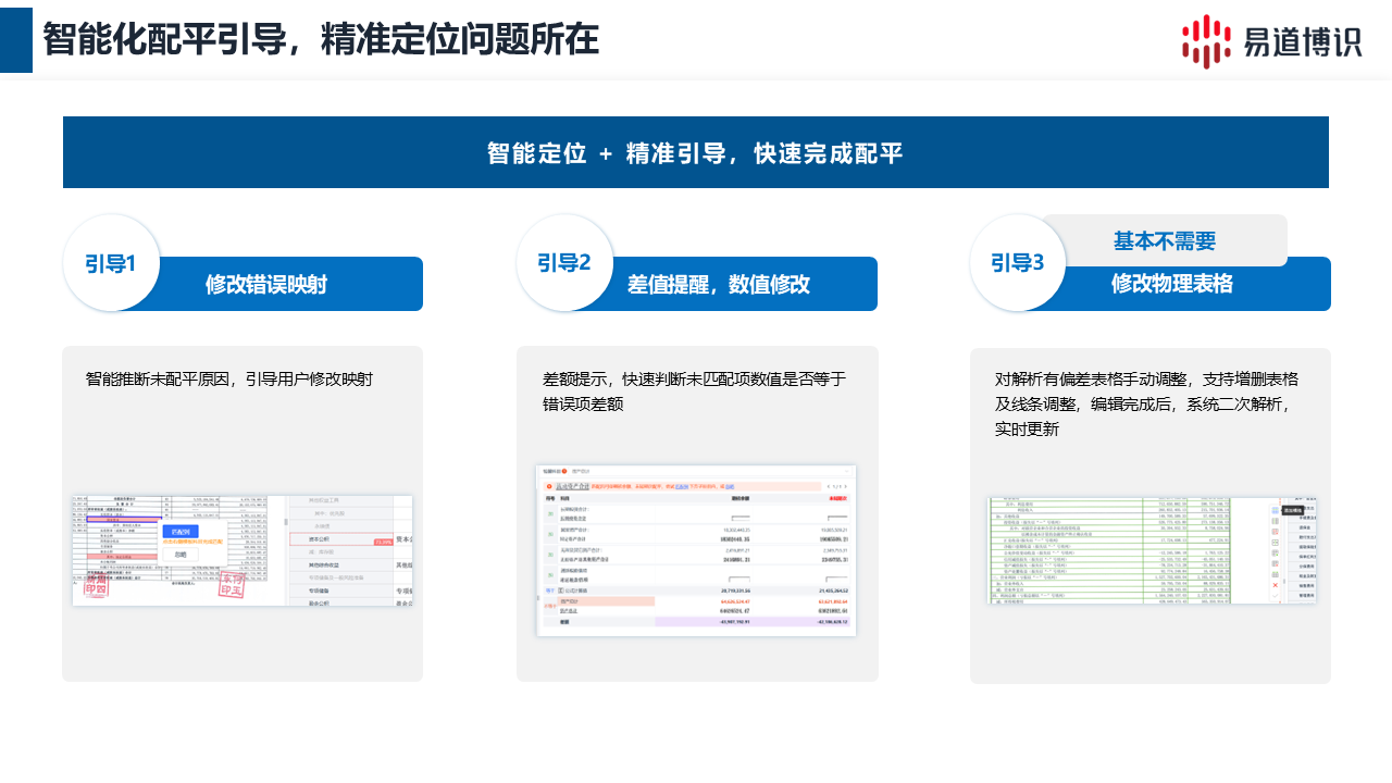 A:通過界面的智能化配平引導(dǎo),系統(tǒng)允許用戶從“修改錯誤映射”、“依據(jù)差值提醒修改數(shù)值”,甚至“直接手動編輯原圖表格讓系統(tǒng)二次解析”三個層面向下調(diào)整歸一數(shù)據(jù),過程可視化且步驟清晰。